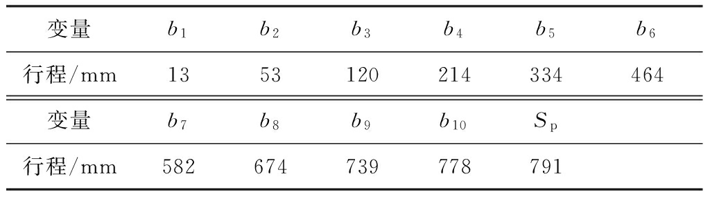该工作面中部跟机自动化具体参数:l=1.5 m,Df=3,Db=3,Nc=10,Dc=18,Sp=0.8 m,α=1°。使用跟机自动化数学模型对该工作面的参数进行计算,所得每节溜槽的推移距离bi、推移步距Sp见表1。可看出推移步距为0.791 m,与工作面要求的步距(0.8 m)误差为1.1%。