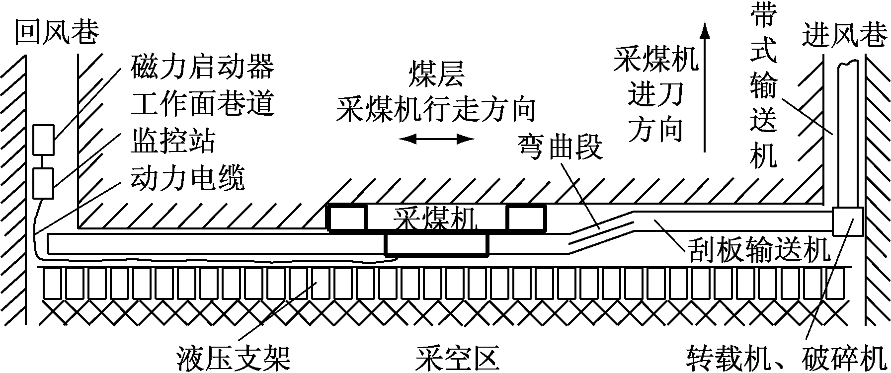 综采工作面设备布局如图1所示。在综采工作面生产作业过程中,液压支架掩护内部的设备、人员。采煤机通过行走齿轮咬合刮板输送机上的销排实现左右行走[18-19],同时左右摇臂带动滚筒根据工作面情况适当上升与下降,行走前方滚筒在上方割顶刀,后方滚筒在下方割底刀。刮板输送机将截割下来的煤运出工作面。
