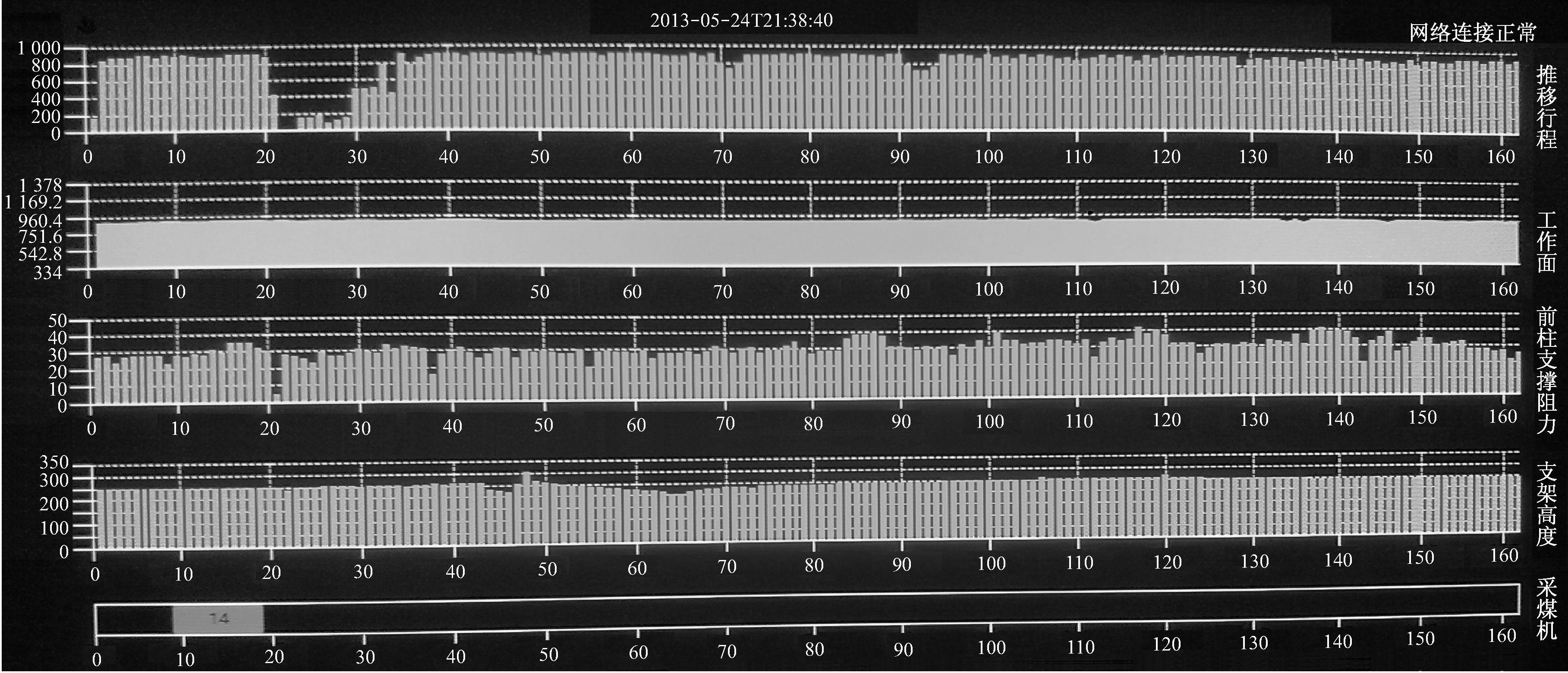 基于跟机自动化数学模型的跟机自动化控制系统已在3107工作面正常使用,监控画面如图6所示。从最上面一排柱状图的长短可看出推移千斤顶位移的变化情况,从而可以直观地观察刮板输送机的弯曲段变化情况。跟机自动化工艺过程与本文所建数学模型相吻合。