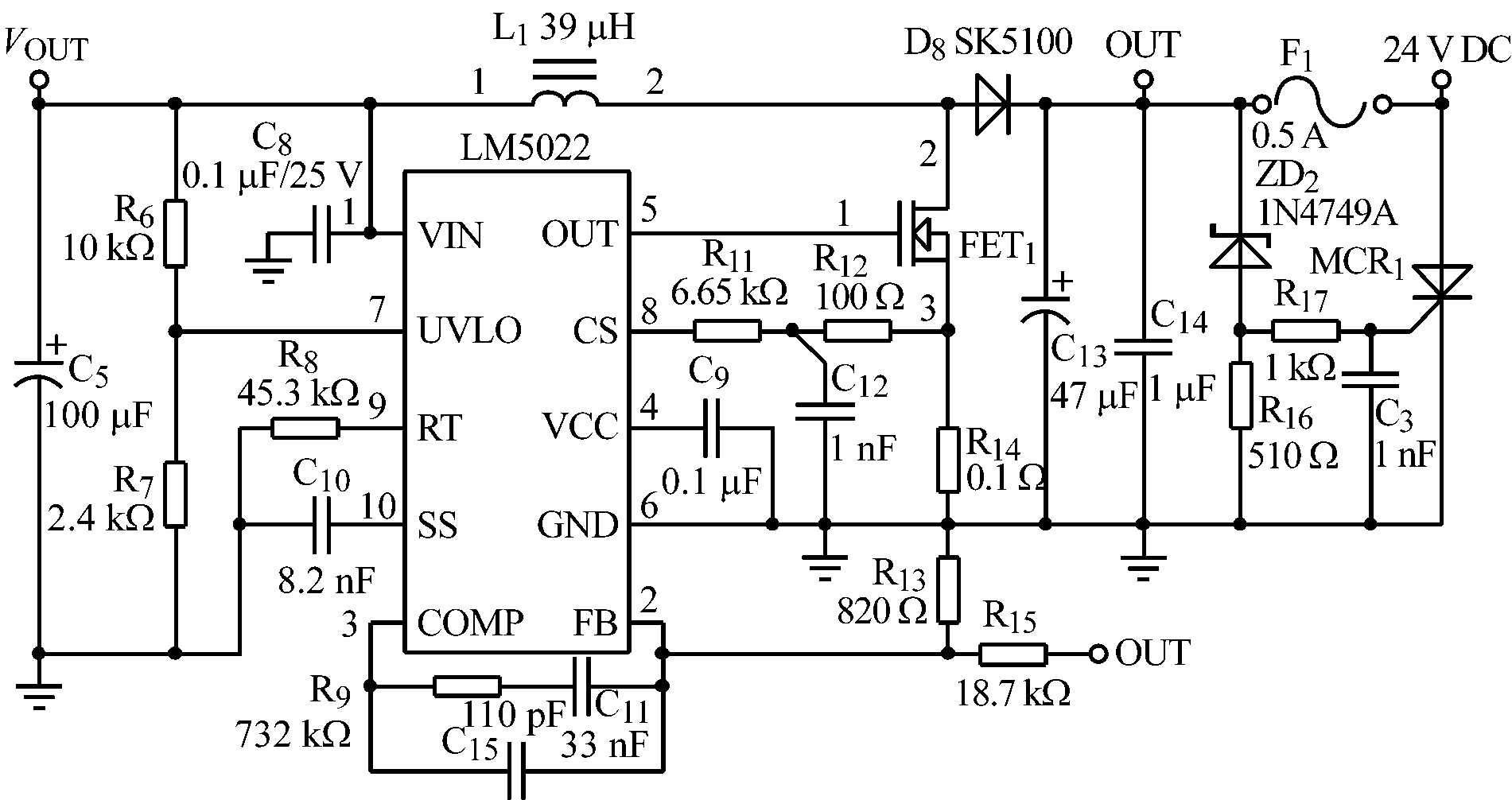 升压电路可将9~24 V电压转换为24 V直流电压,具体电路如图5所示。该电路主控制芯片选用静态功耗相对较小、电路转换效率高达92%的LM5022,可使本安电源的输出能量尽量传输至负载。由于电源电路为升压电路,为保证后级限能电路的安全性和可靠性,需增加一级不可恢复的过压保护电路。过压保护电路由ZD2,R16,R17,C3,F1和MCR1组成。当升压电路输出电压超过26 V时,将触发MCR1导通,保险丝F1熔断,从而达到保护后级电路安全性的目的。