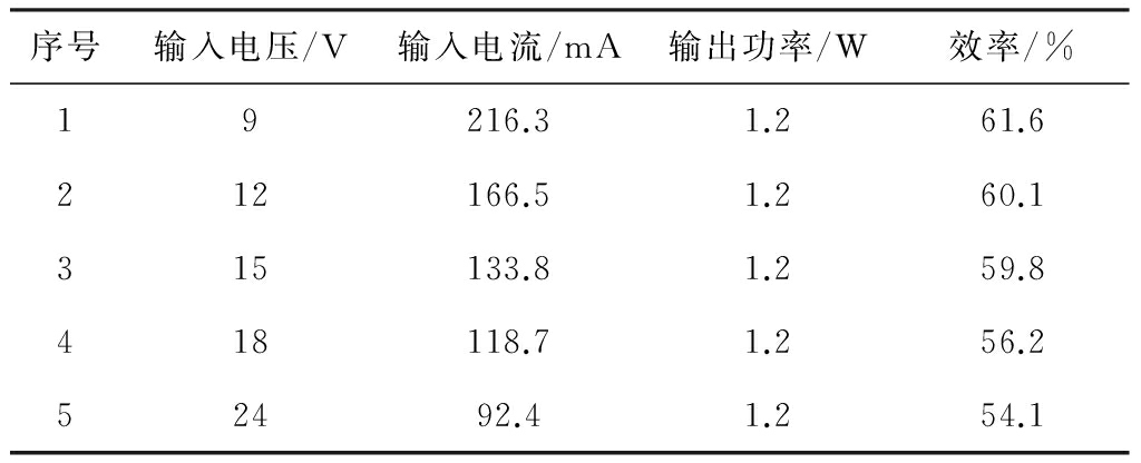5个输入电压下的测试结果见表2。从表2可知,在9~24 V输入电压波动范围内,整机电源的效率都在54.1%以上。