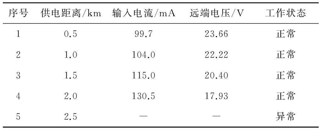 输入电压范围为9~24 V时的低浓瓦斯传感器的供电距离测试结果见表3。从表3可知, 24 V本安电源带低浓瓦斯传感器时的实际最大供电距离为3.5 km。