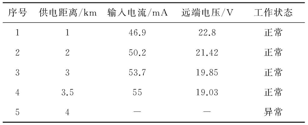 用中继电源为3.5 km处的低浓瓦斯传感器供电,由本安电源为中继电源供电。将本安电源与中继电源的供电距离逐步增加,测试中继电源工作状态下的最大供电距离,测试结果见表4。从表4可知,在24 V本安电源与低浓瓦斯传感器之间增加一个中继电源后,可使24 V本安电源对瓦斯传感器的供电距离提高2 km,达到5.5 km。