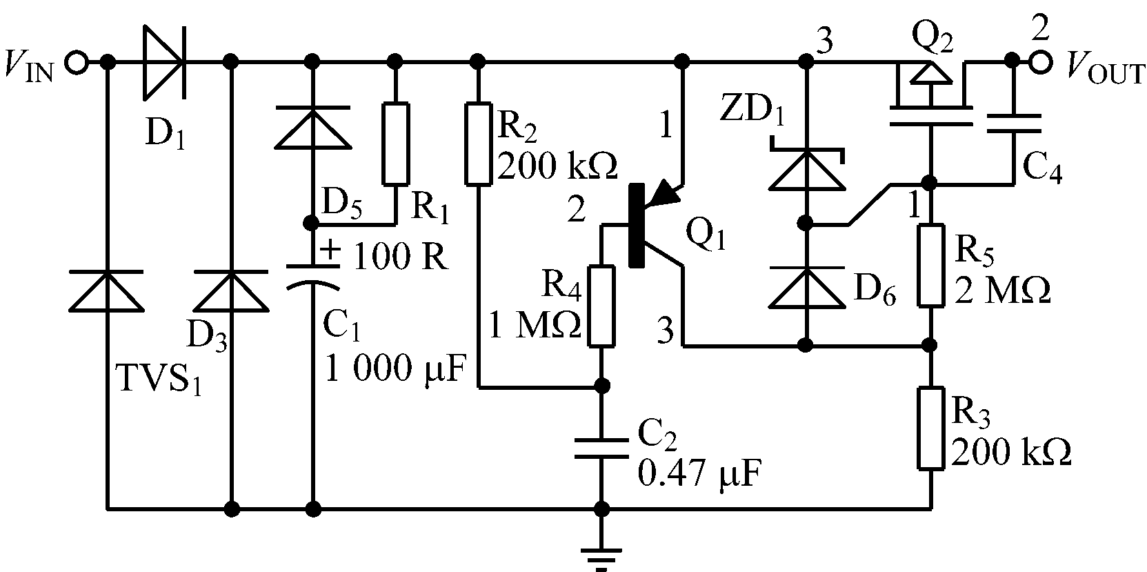 软启动电路主要用于降低中继电源启动时的瞬间电流,储能电路主要用于维持中继电源正常启动后的稳定性,具体电路如图4所示。上电后本安电源先对电容C1充电,电容充电完成后开启MOS管Q2,这样分时启动电路可以避免启动时电容的瞬时大电流导致电路无法正常工作的情况。