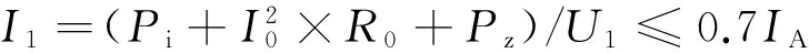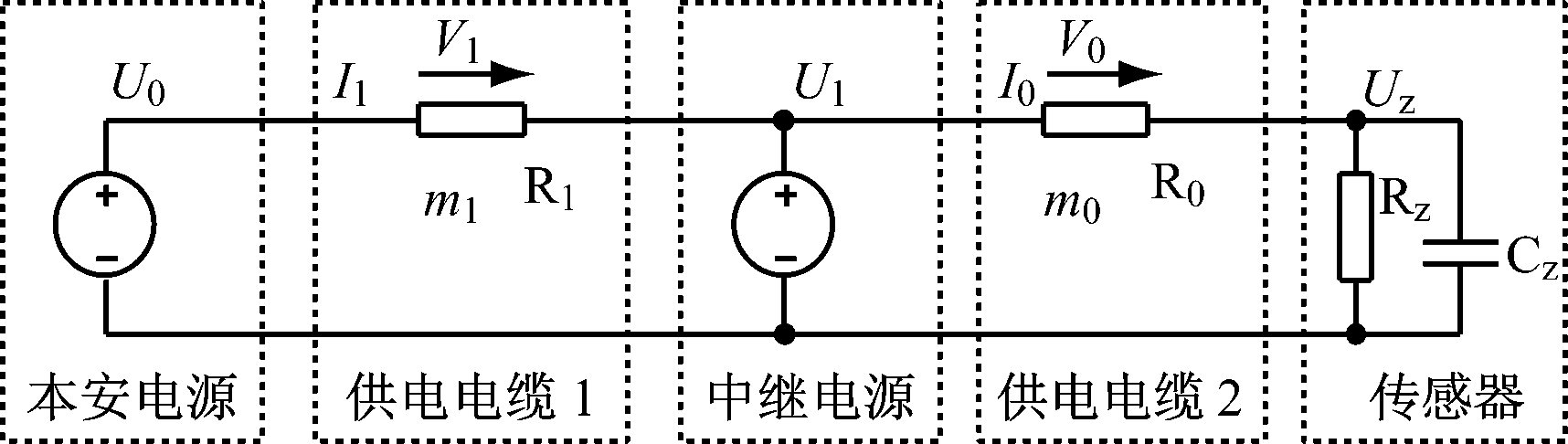 式中:P0为本安电源输出功率;I1为流过第1段供电电缆的电流;R1为第1段供电线路电阻;Pi为中继电源静态和转换消耗功率;I0为流过第2段供电电缆的电流;R0为第2段供电线路电阻;Pz为传感器功耗;U1为中继电源输出电压;IA为本安电源输出电流。