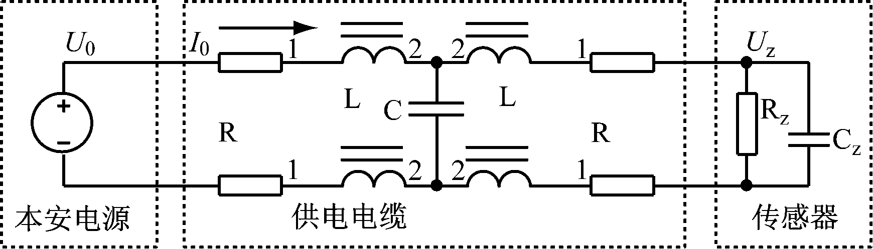 本安电源向矿用传感器远程供电的等效电路模型如图1所示,其中矿用供电电缆一般采用多芯截面积为1.5 mm2的电缆,其分布电容为60 nF/km,分布电感为0.8 mH/km,分布电阻为12.8 Ω/km。