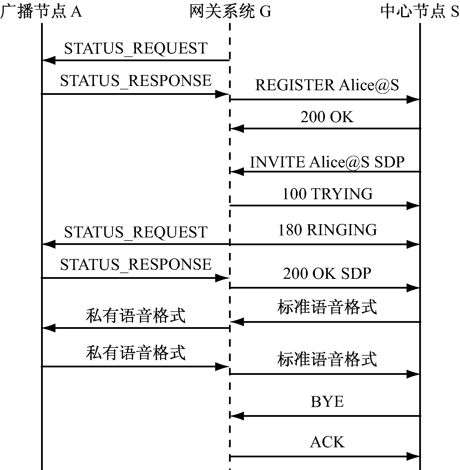 IP广播节点在通信业务上能够支持基于IP地址的状态巡检和点对点定向寻呼与对讲。网关系统G首先向广播节点A发送STATUS_REQUEST状态巡检请求,广播节点A返回STATUS_RESPONSE状态巡检响应则表明广播节点A工作正常,然后网关系统G以广播节点A对应的预设账号Alice向中心节点S发起REGISTER注册,该巡检及注册过程周期性进行。对于中心节点S向广播节点A发起的语音通信,一方面中心节点S经由网关系统G转换向广播节点A广播讲话,另一方面广播节点A经由网关系统G转换向中心节点S回话,该双向语音通信由调度员挂机触发中心节点S向网关系统G发送BYE信令结束。网关系统支持全双工通信,对于半双工广播节点,双向语音通信过程中网关系统在接收不到广播节点语音媒体情况下,将向中心节点发送静音包。