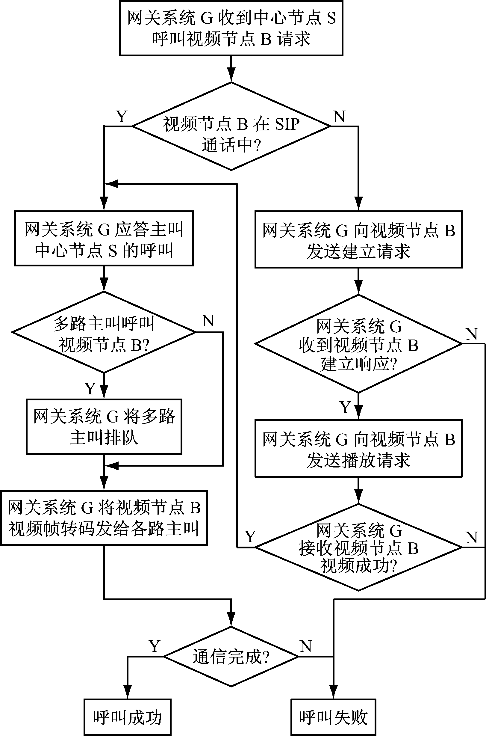 当网关系统G收到中心节点S呼叫视频节点B的请求时,先判断视频节点B是否已在SIP视频通话过程中,如果没有则按图6流程进行单呼控制处理,否则网关系统G直接成功应答中心节点S,并将该路主叫加入视频节点B对应的主叫队列。视频通话时,网关系统G将视频节点B的视频流分发给每路主叫。网关系统收到所有主叫的BYE通话结束信令时,才实际结束视频通话。