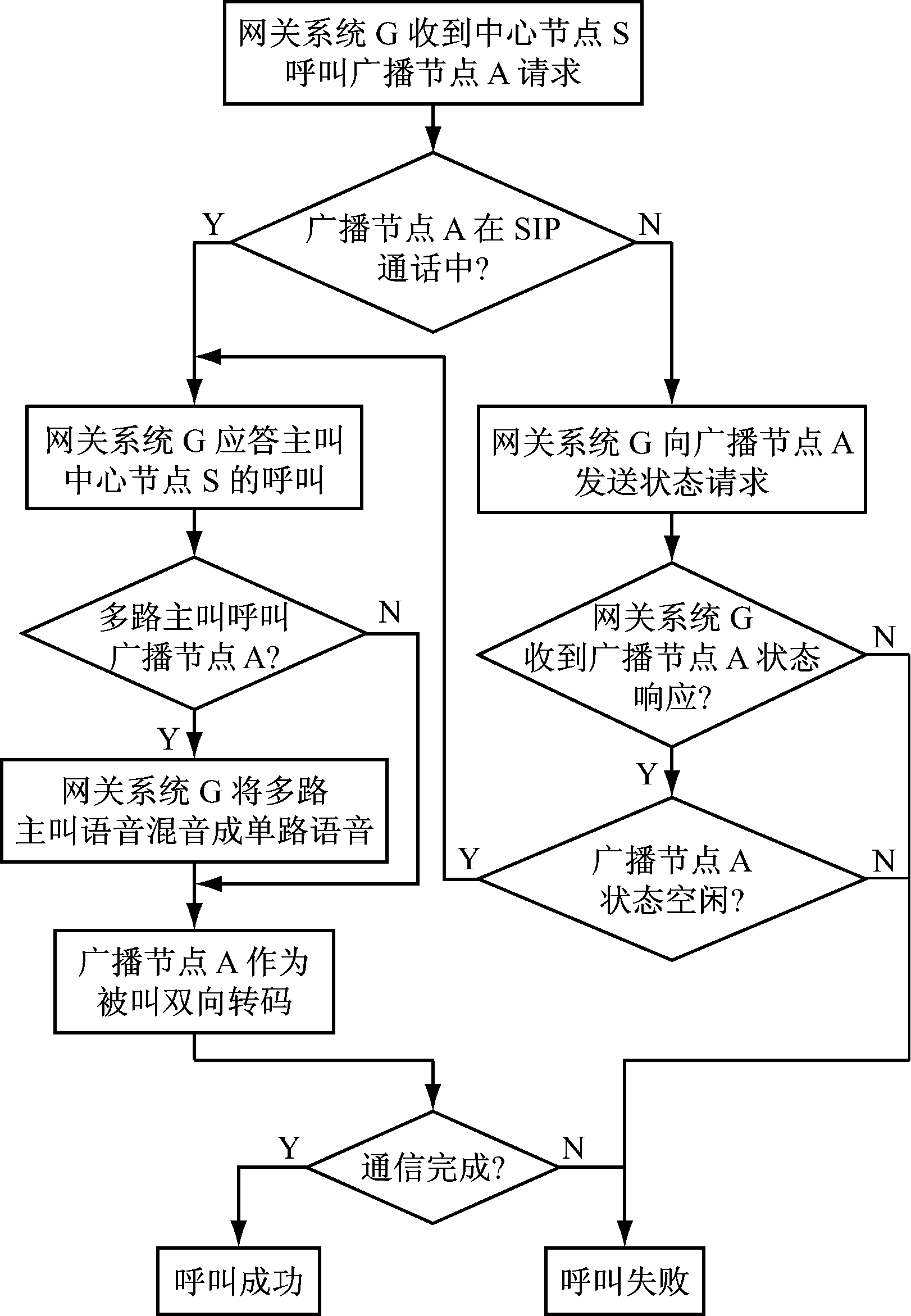 网关系统G代理了广播节点A与中心节点S所有信令与媒体的通信,当网关系统G收到中心节点S呼叫广播节点A的请求时,先判断广播节点A是否已在SIP通话过程中,如果没有则按图4流程进行单呼控制处理,否则网关系统G直接成功应答中心节点S并将该路主叫加入广播节点A对应的主叫队列。双向语音通信过程中,网关系统G将广播节点A的多路主叫语音混音成一路语音发送给广播节点A,并将广播节点A的回话分发给各路主叫。网关系统收到所有主叫的BYE通话结束信令时,才实际结束双向语音通信。