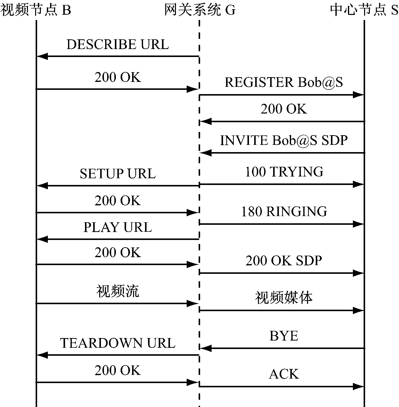 网关系统G首先向视频节点B发送RTSP的DESCRIBE视频通道描述请求,视频节点B返回200 OK响应则表明视频节点B工作正常,然后网关系统G以视频节点B对应的预设账号Bob向中心节点S发起REGISTER注册,该请求及注册过程周期性进行。中心节点S向视频节点B发起视频查看呼叫时,由于视频节点B只发送视频而不接收视频,网关系统G在通话建立成功后向中心节点S发送200 OK SDP信令,该信令中设置会话为SEND ONLY属性,中心节点S收到200 OK SDP信令后开始单项视频流通信过程。