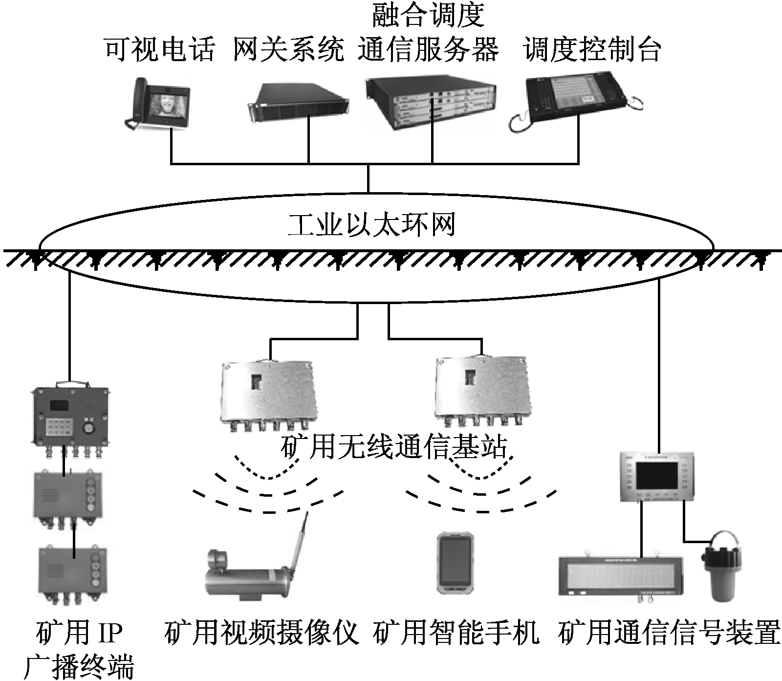 现阶段井下应用的电话通信系统、无线通信系统、广播通信系统、工业视频系统、应急通信系统及通信信号装置自成体系,矿井融合调度通信系统可为上述系统及装备提供高效的统一通信业务平台,实现融合通信与一体化调度业务,其拓扑结构如图1所示。