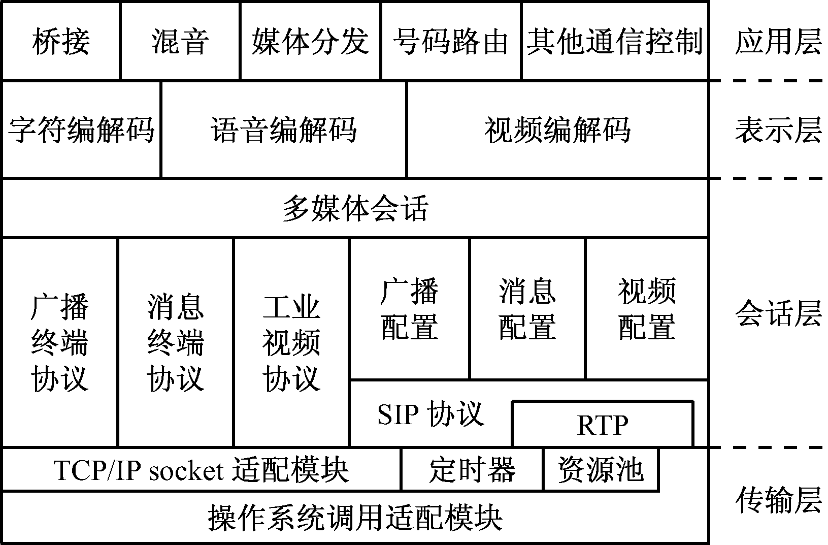 (3) 表示层。网关系统表示层主要涉及字符、语音和视频的编码与解码。网关系统内核实现常用字符、语音和视频编解码功能,供具体通信会话类型模块高效调用,满足矿井常用音视频通信业务的媒体格式需要。特定通信会话类型采用的私有表示格式则在该通信会话类型对应的具体模块内部予以设计并实现。