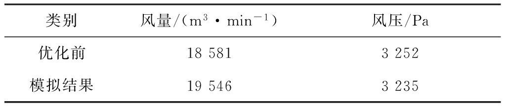 投入生产时,备用工作面预计需风量为110 0 m3/min 左右,为了判断以上优化调控方案是否可行,拟采用VENTSIM三维通风动态仿真模拟系统事先进行通风模拟分析。首先将南回风巷和南北回风的第1条联络巷冒顶段的摩擦阻力系数分别更改为其正常段的值,即0.013 Ns2/m4和0.013 Ns2/m4,其次将备用工作面的固定风量标志去除,然后输入主要通风机工作角度的特性曲线数据,之后进行通风模拟,模拟结果见表3、表4。