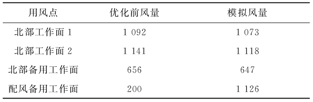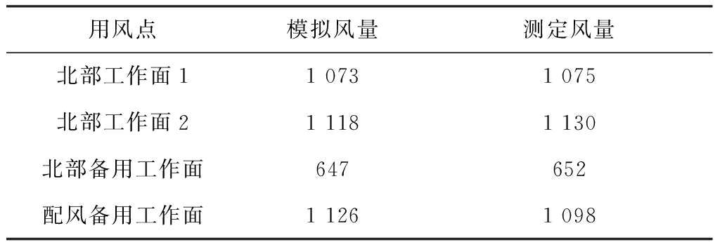 根据以上模拟结果可知,主要用风地点的风量均满足用风需求,因此,可以判定上述优化调控方案是可行的。为了验证模拟结果的可靠性,矿方按照上述优化调控方案进行了工程实施,工程实施之后进行了现场测定工作,测定结果见表5、表6。