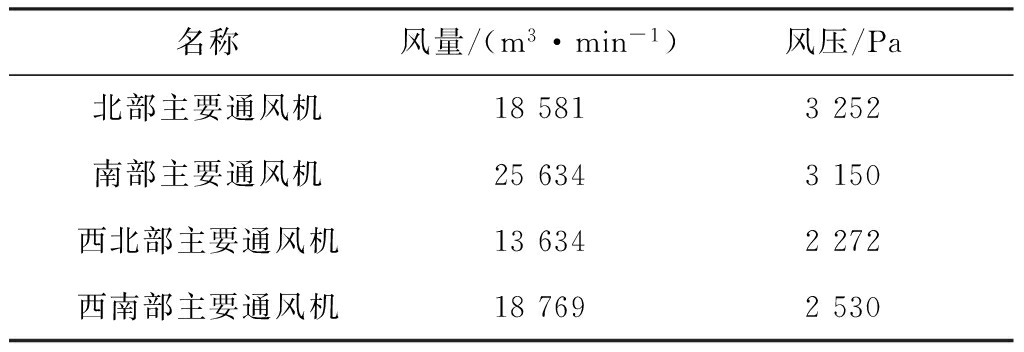 (3) 为获取该矿的通风基础参数,进行了通风阻力测定工作。由于该矿通风系统复杂、采区覆盖区域大,故采用气压计基点法进行测定。一共布置319个测点,历时15 d完成测定工作。测定的数据包括:地面的大气压力(每隔5 min测量1次,用于对井下测定的压力值进行校正);测点的绝对压力、测定时间、温度、湿度、标高;测点所在巷道的风量、断面形状、巷宽、巷高、支护形式;4台主要通风机的工况点等。数据处理完成后,将巷道的摩擦阻力系数及主要通风机工况点数据、37个掘进巷道的风量输入到三维巷道实体图中,选取巷道的局部阻力系数。