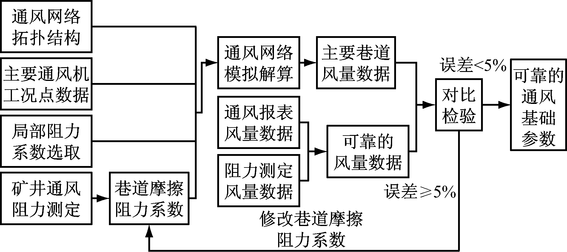 可靠的矿井通风基础参数是保障通风系统优化调控模拟结果准确的必要条件,矿井通风基础参数主要依靠矿井通风阻力测定及通风网络模拟解算获取。