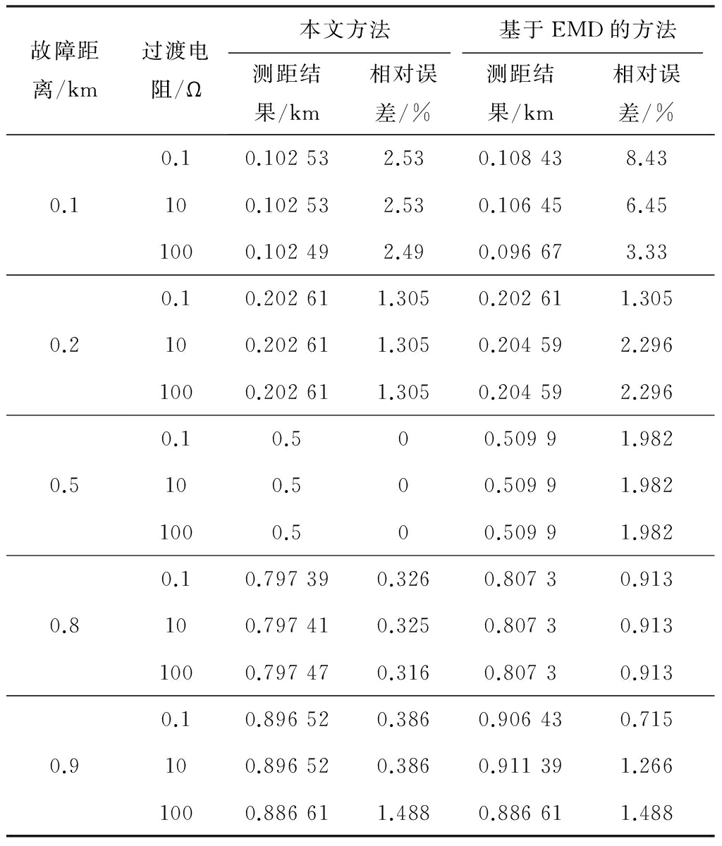 为了对比分析本文方法较传统EMD方法的优势,对不同过渡电阻和不同故障位置的情况,分别采用本文方法和基于传统EMD的电缆故障测距方法进行仿真计算,结果见表2。