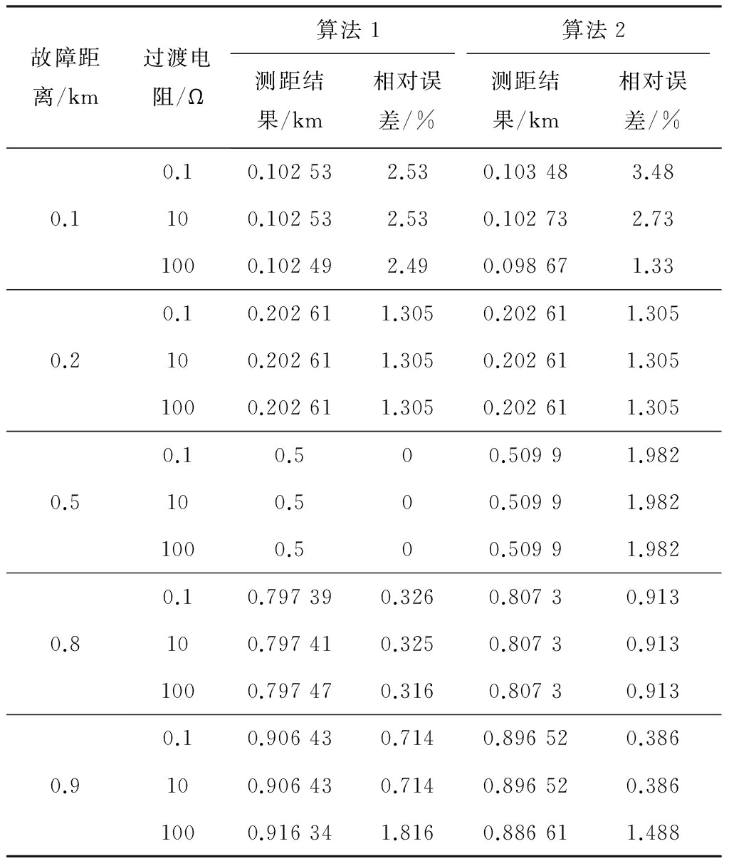 为了进一步验证本文方法的有效性和测距精度,对不同过渡电阻和不同故障位置的情况,分别利用2种波头标定算法进行电缆故障测距仿真计算,结果见表1。