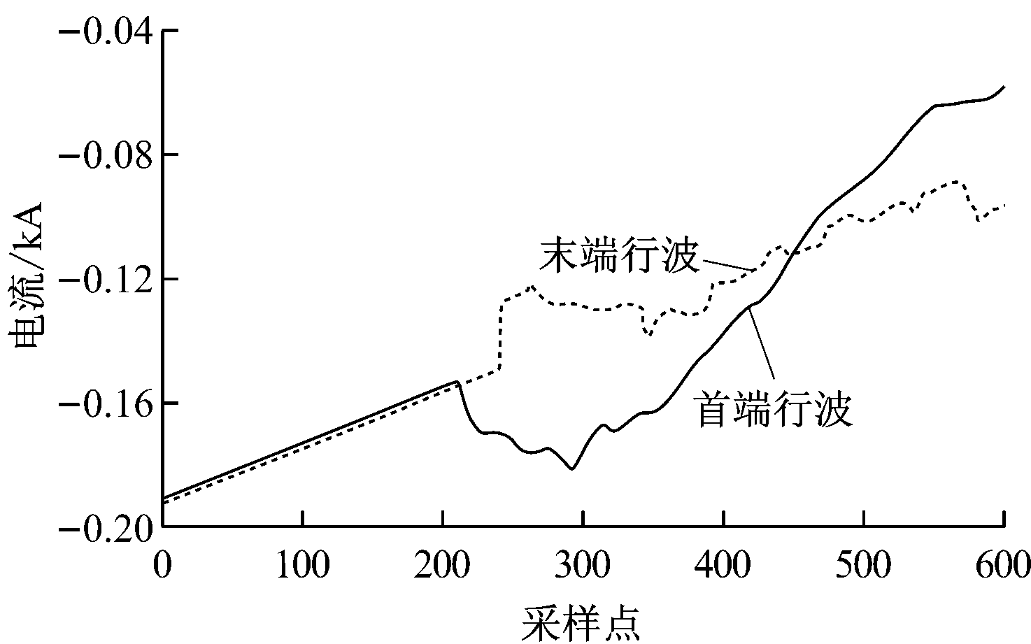 (2) 分别对双端采样的三相电流进行相模变换,求出其α模分量,提取t=0.019 8~0.020 4 s的电流行波α模分量进行分析。双端行波线模分量如图3所示。