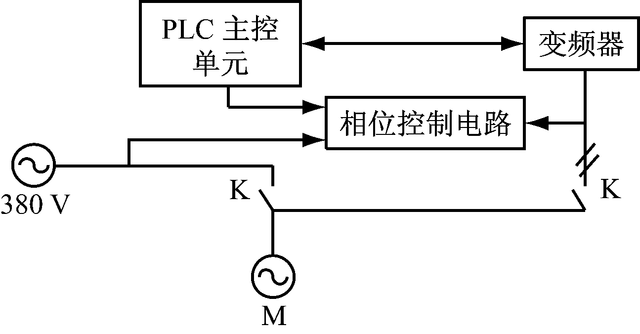 煤矿电动机应急调速系统工作原理如图2所示。若电动机在原始变频器故障后处于转动状态,则切换系统中的锁相环同步控制器。当锁相环同步控制器检测到应急变频装置与电动机同频同相时,将应急变频装置与电动机的接触器闭合,从而实现应急变频装置对电动机转速的稳定控制;若电动机在原始变频器故障后处于停止状态,则采用应急变频装置重新启动电动机。