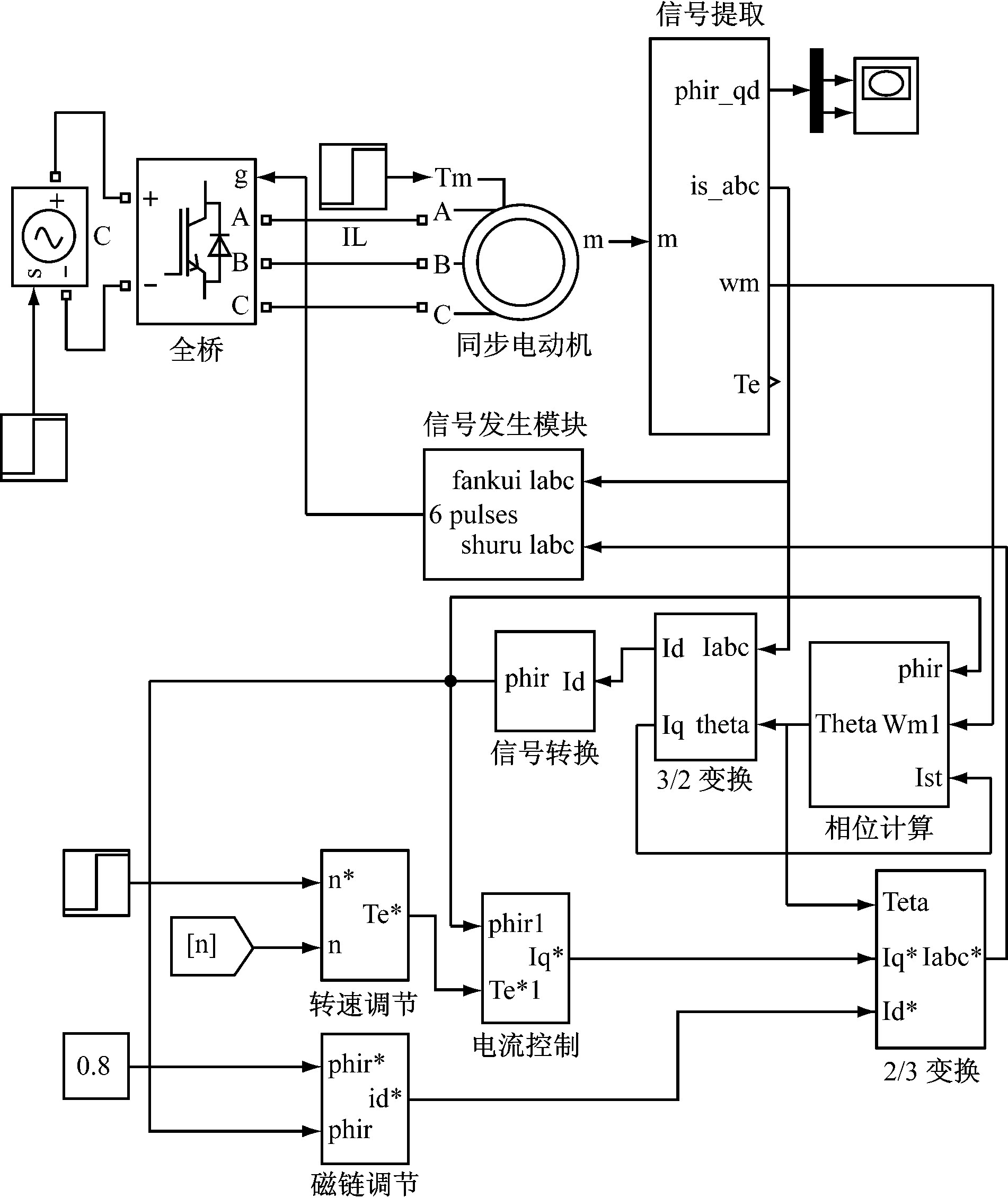 为验证煤矿电动机应急变频调速系统的快速响应能力,在Matlab/Simulink环境下建立系统模型,如图8所示。具体参数如下:额定功率PN=200 kW,额定电压UN=380 V,频率f=50 Hz,定子电感L=20 mH,定子电阻R=0.03 Ω,转子电感Lr=19 mH,转子电阻Rr=0.026 Ω,转动惯量J=2.56 kg·m2,直流电压Udc=900 V,电磁常数T=0.016。