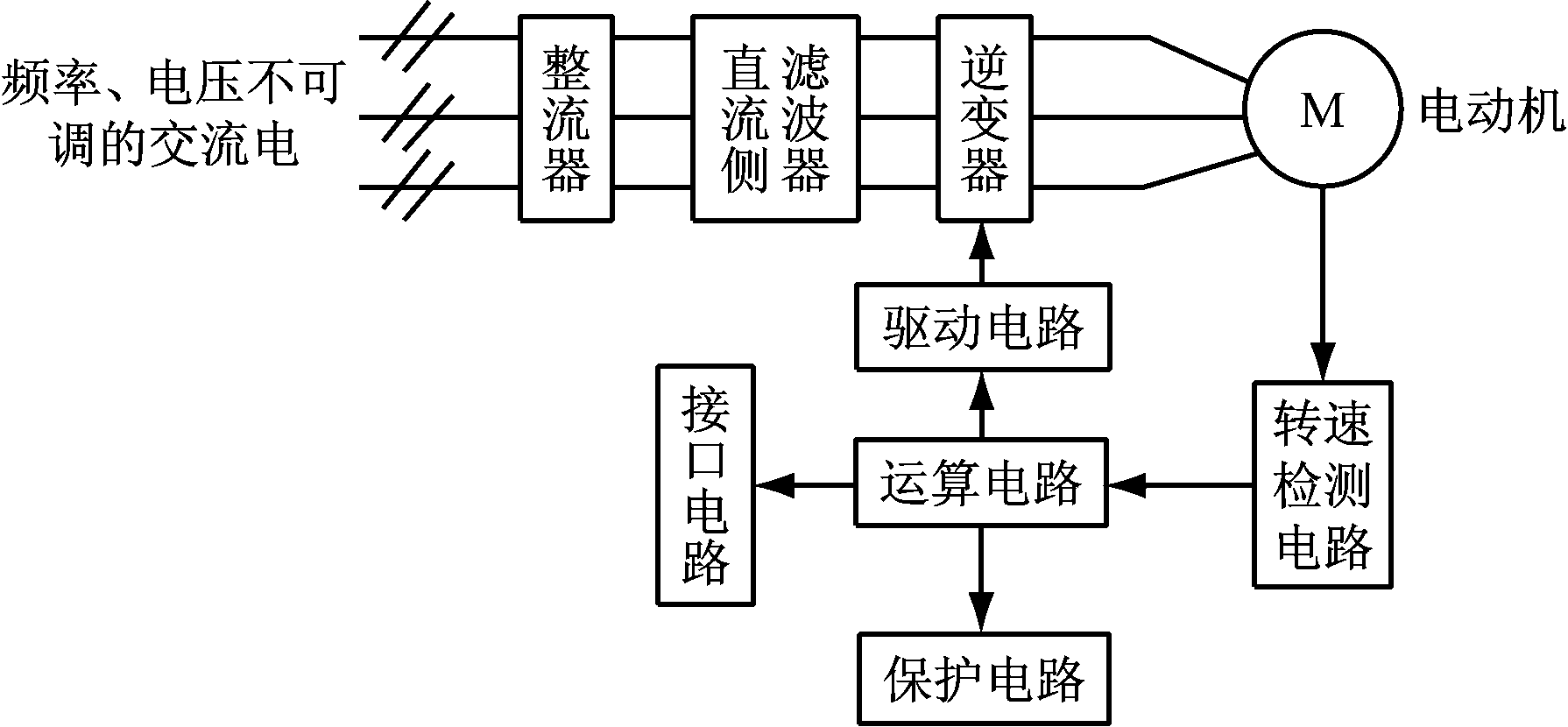 应急变频装置为交-直-交结构,其电路结构如图3所示。该装置主要由主电路和控制电路组成,其中主电路包括整流器、直流侧滤波器、逆变器。整流器用于将三相交流信号转换成直流信号,直流侧滤波器用于吸收整流侧和逆变侧的脉动电压,逆变器则用于将直流信号转换成交流信号。控制电路由转速检测电路、运算电路、驱动电路和保护电路等组成。检测电路主要用于检测系统的电压、频率等信息。运算电路主要负责处理反馈信号,得到输出信号的参考值。驱动电路用于控制开关器件的通断。保护电路用于保护变频器和电动机。