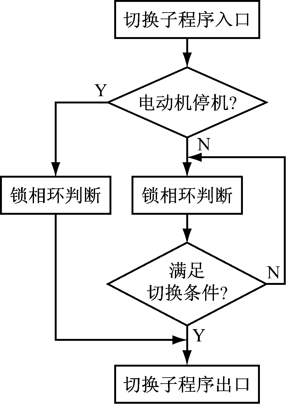 PLC主控单元切换程序流程如图7所示。首先判断原变频器故障后电动机是否停机,若电动机处于停机状态,则切换程序重新启动电动机;若电动机没有停机,在故障变频器停止工作后,延时2 s,启动应急变频装置并封锁其输出,通过锁相环同步控制器检测应急变频装置相位和频率是否与电动机一致,一旦检测到同频同相,则切换程序通过控制接触开关控制电动机继续工作。