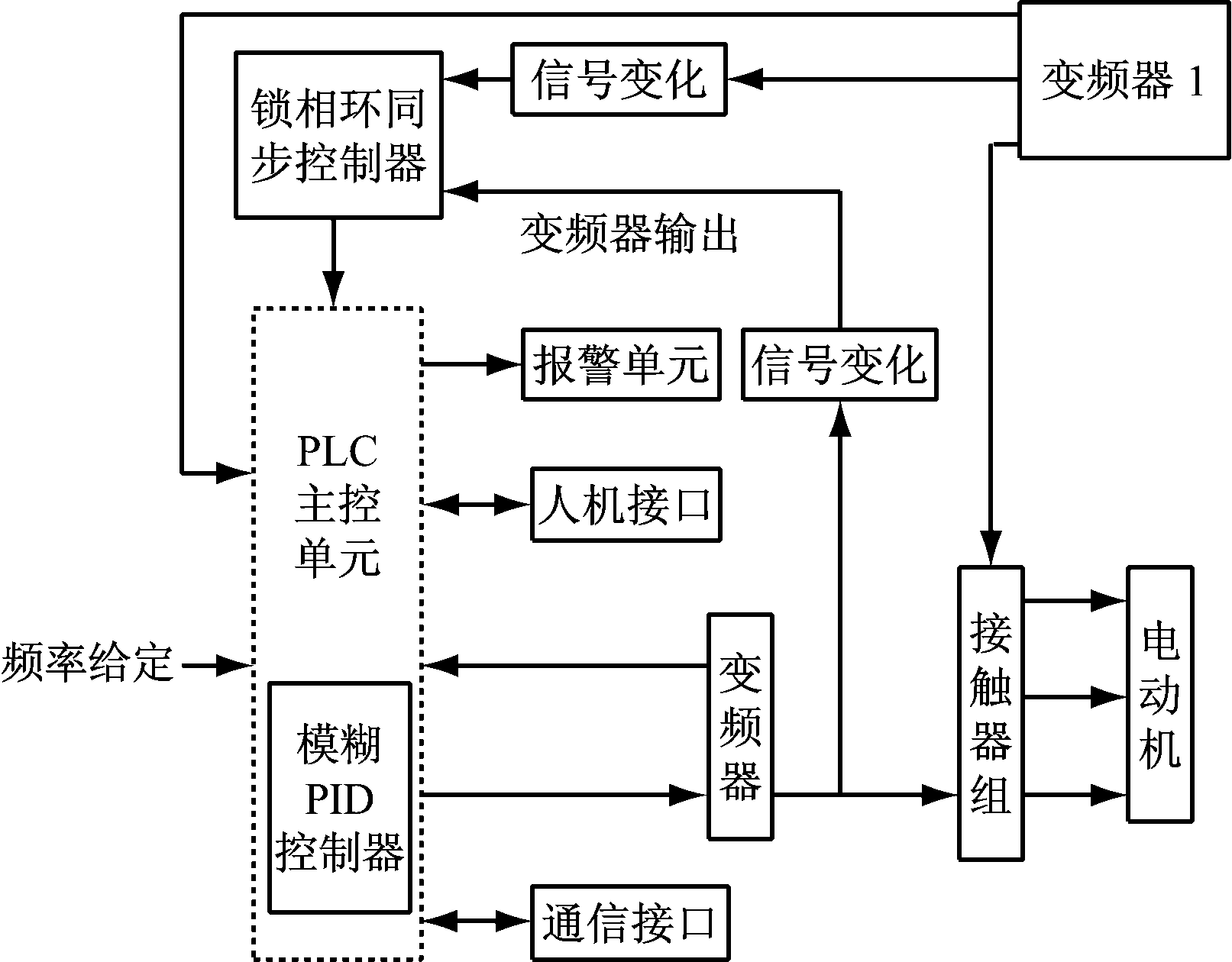 随着计算机和电力电子技术的迅速发展,采用变频器控制的电动机调速系统逐渐代替了传统的电动机调速系统。基于电力电子技术的变频器调速控制系统具有快速、稳定的特点,在工业应用中得到了普及,成为主流的调速设备[1-4]。但是,变频器的主电路是由电力电子开关器件组成,当发生故障时很难在较短的时间内恢复正常运行,所以一旦故障就会导致电动机非正常运行,影响煤矿生产系统的正常运行。针对这一问题,本文设计了一种煤矿电动机应急调速系统。该系统由应急变频装置、PLC主控单元和切换装置等组成,PLC主控单元根据电动机和变频器的故障状态,采用模糊PID算法实时控制应急变频装置的输出[7-8],一旦应急变频装置的输出达到电动机运行条件,切换装置立即动作,从而实现应急变频装置对电动机的稳定控制。