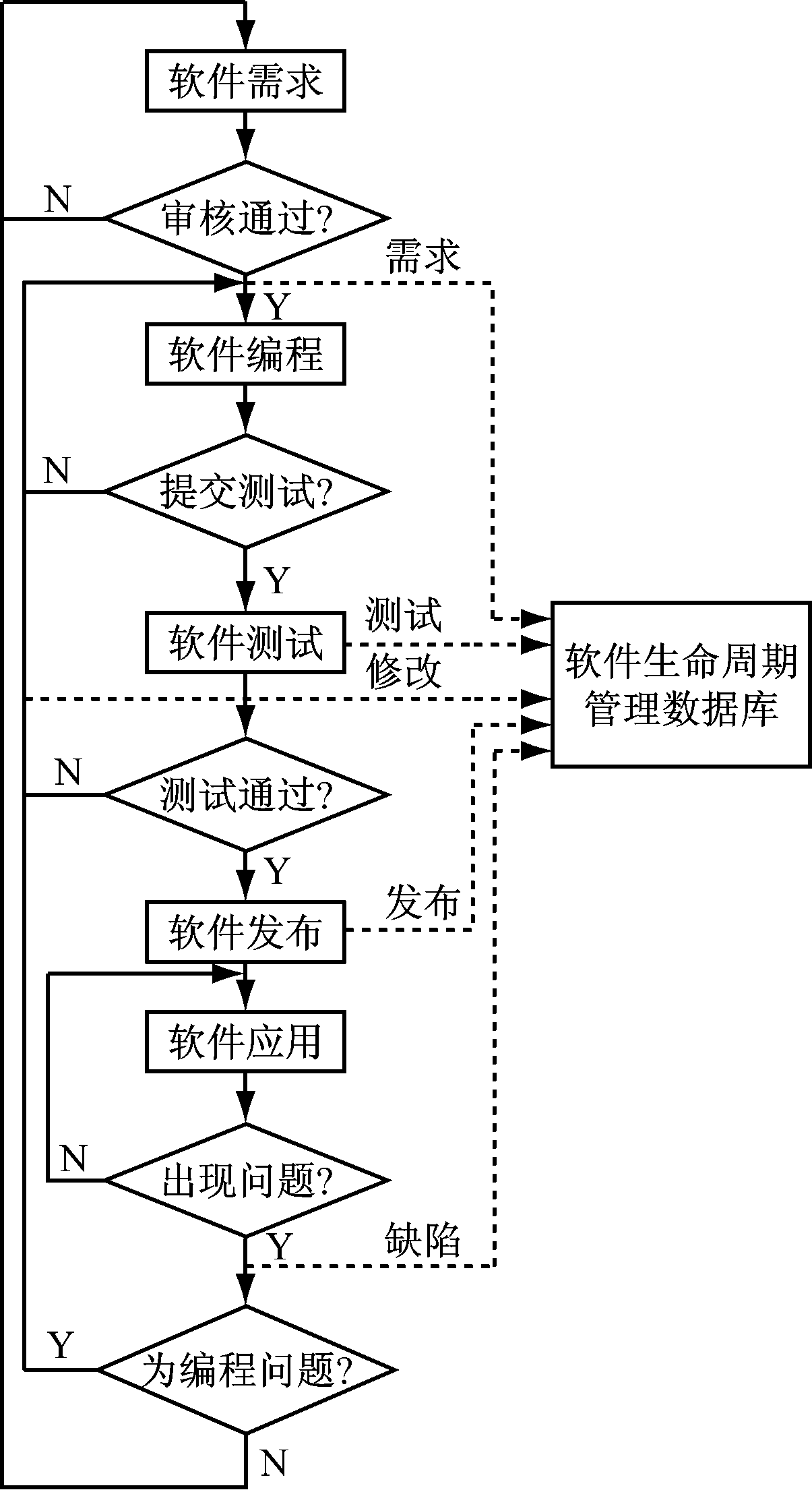 在软件缺陷生命管理中,可提取软件生命周期中各个阶段(需求、编程、测试、修改、发布、使用问题反馈)的工作内容、时间节点和完成人等信息,并保存到软件生命周期管理数据库(如图1所示)。通过计算软件测试被打回和再次提交的时间可以了解软件修复时间,通过软件测试打回次数可以了解项目软件开发的小版本数和软件修复率,通过现场用户提交软件问题报告时间和软件再次发布的时间可以计算出软件修复时间。将软件生命周期中有关软件缺陷的数据信息加以整理、分析、统计,可以形成软件缺陷密度、软件修复率、软件修复时间、软件发布前的缺陷消除率,形成软件缺陷分布图指标,可以对整个软件开发质量进行综合评价。