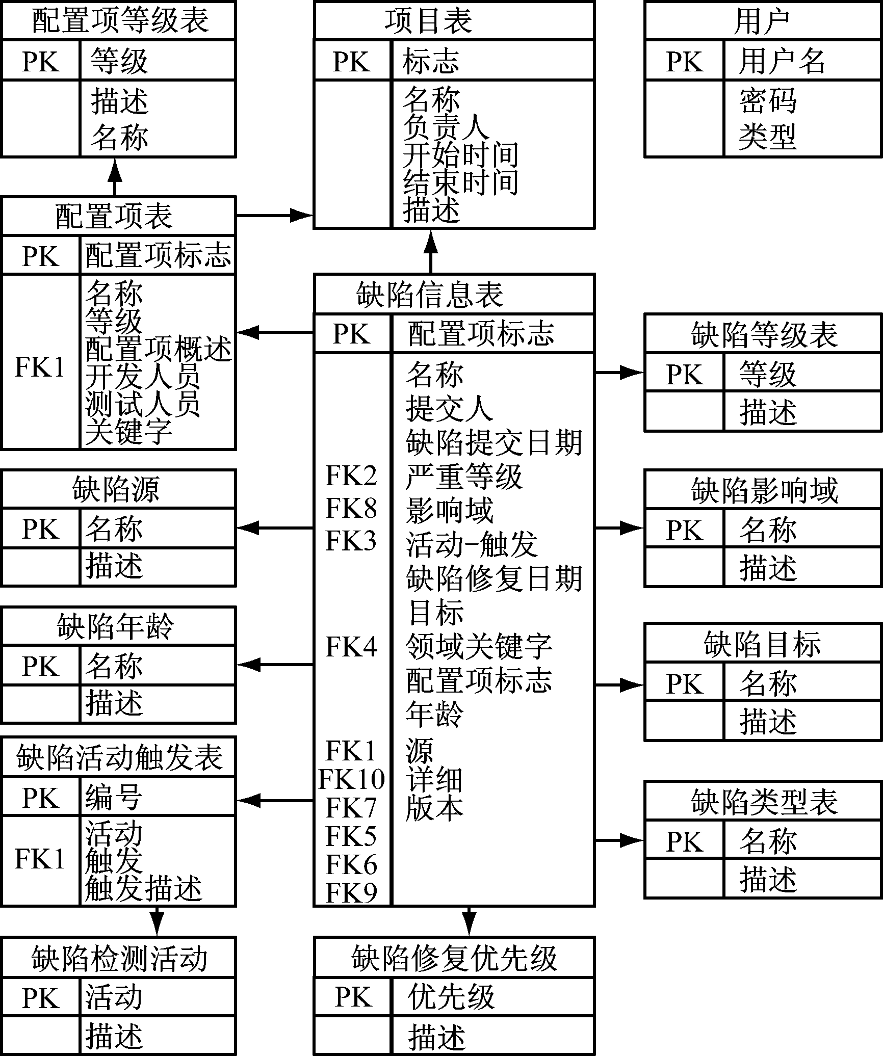 软件缺陷数据库结构[14-18] 如图5所示,其中PK为主键,FK为外键,主要包括缺陷管理人员配置,开发、测试、审核人员信息。缺陷检测活动是指在功能测试、性能测试、可靠性测试等活动中发现软件缺陷。缺陷活动触发是指发现软件缺陷时的环境条件和相关活动及其软件错误征兆。缺陷源、缺陷年龄分别指是否是新代码引入的缺陷及缺陷留存的时间。缺陷目标是指修复的是需求、设计、编码、集成等哪个阶段的实体。缺陷影响域是指软件缺陷对软件质量属性的影响情况,如功能性、可靠性、效率特性、易用性、可维护性、可移植性等。缺陷等级分为A级、B级、C级。缺陷数据库还包含进行软件缺陷发现、确认、修复等相关活动的人员与时间记录。为了方便系统维护,缺陷等级、缺陷影响域、缺陷目标、缺陷类型、缺陷年龄、缺陷源、缺陷检测活动等可使用数据字典的形式存储。