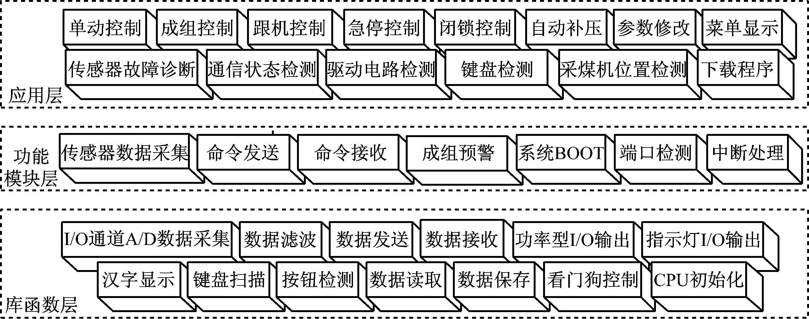 液压支架电液控制系统软件采用模块化设计,由3层结构构成,如图2所示。底层是建立在物理层电路板驱动层级的库函数和数学模型库,其功能是实现电路的基本功能转换,提供基本数学模型处理功能;中间层为功能模块层,通过调用底层库函数实现单一的软件功能;顶层为应用层,通过调用不同组合的功能模块,实现应用软件的各项功能。