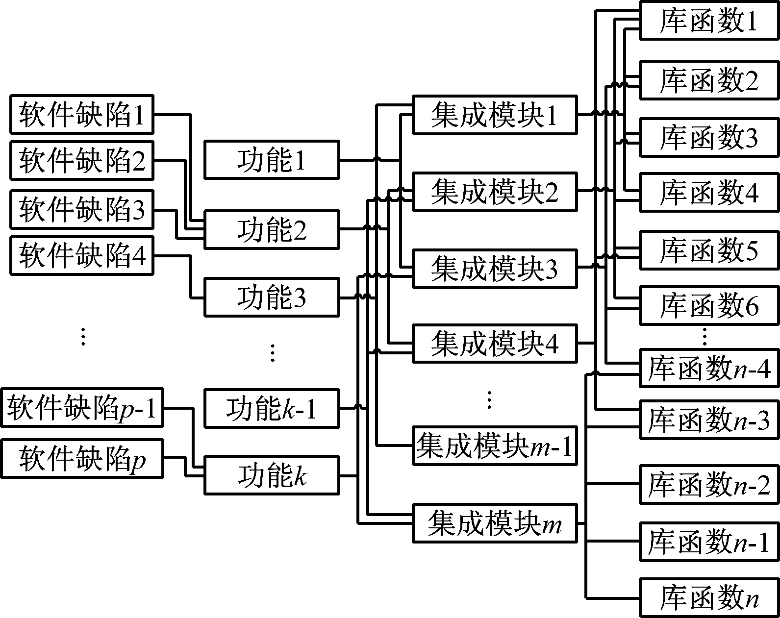 液压支架电液控制系统软件缺陷管理框架建立在系统软件结构上。将每一个软件缺陷定位在一个确定的功能模块上,通过软件的3层结构对软件缺陷进行分析,确定每个功能的缺陷密度,再通过功能、功能模块和库函数的引用关系,深度挖掘潜在的软件错误,将软件的3层结构以数据库形式存储,建立功能、功能模块、库函数3个层次的关系数据库,如图3所示。