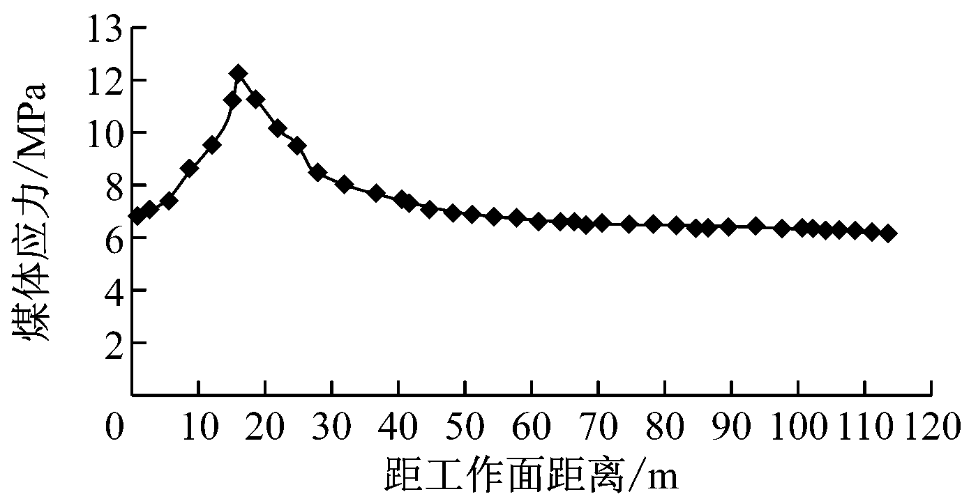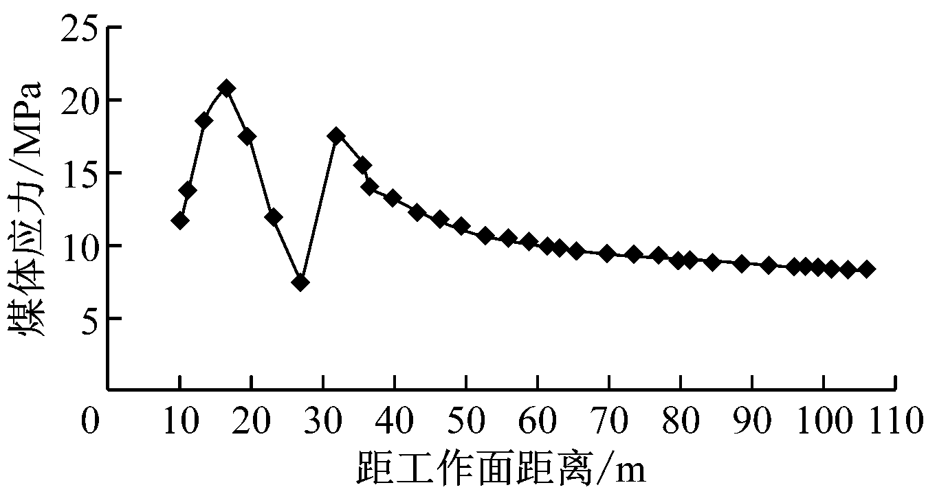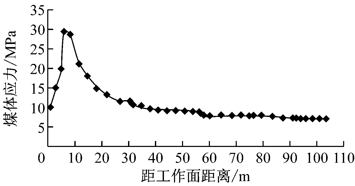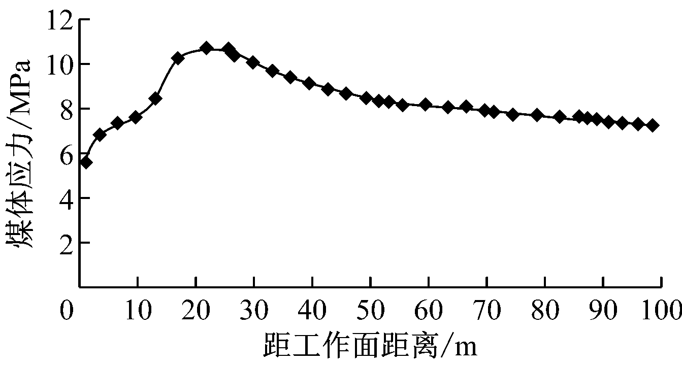 根据1号—4号钻孔应力计监测结果,得到工作面超前支承压力影响范围为0~60 m,平均峰值位置为10~20 m。实测结果符合煤体超前支承压力的变化规律。