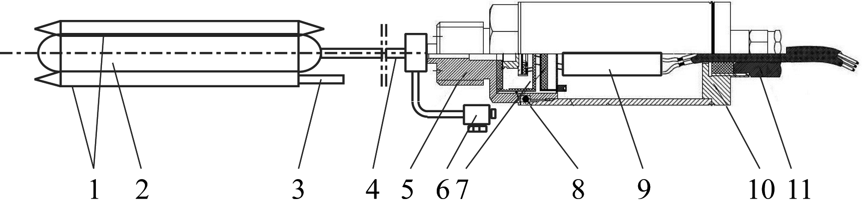 1-包裹体;2-压力枕;3-安装插头;4-导压管;5-连接头;>6-注油嘴;7-双层电阻栅SOI应变计;8-密封圈;9-控制电路板;10-变送器腔体;11-出线口