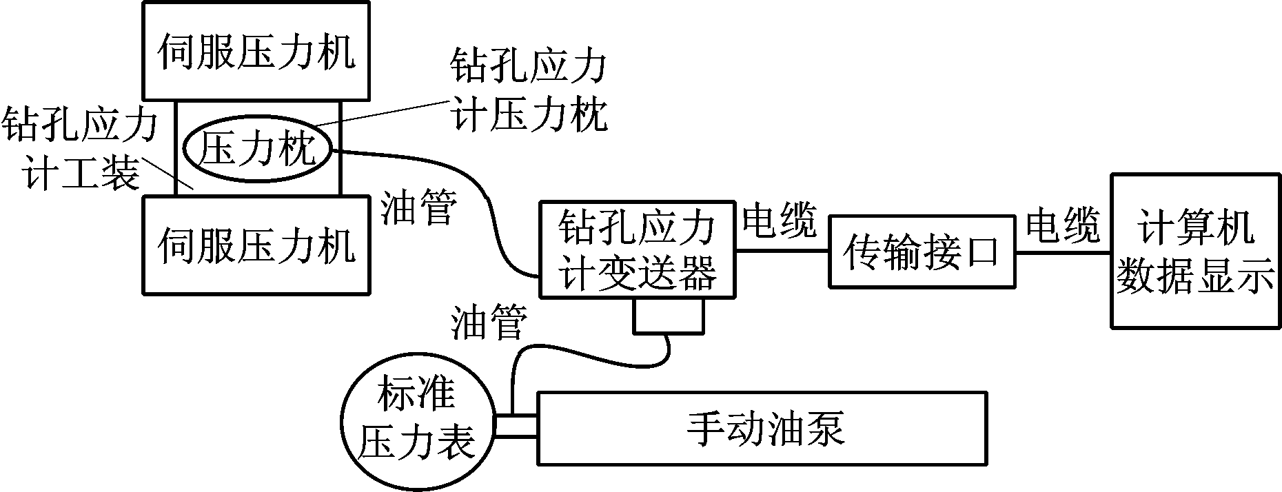 对采用双层电阻栅SOI应变计的钻孔应力计进行实验,实验方案:在实验室条件下由伺服压力试验机进行加载,实验设备包括1台钻孔应力计、1台传输接口、1台计算机、1台手动油泵,钻孔应力计固定在压力机上。设备连接如图6所示。固定钻孔应力计的工装为具有弧面的铁块。钻孔应力计注油后的初始压力为2.26 MPa(矿用钻孔应力计测量的孔内受压一般用压强表示),压力机加载压力由初始的9.82 kN加至60 kN,历时85 min。钻孔应力计每1 s采集一次数据,终止压力值为12 MPa。
