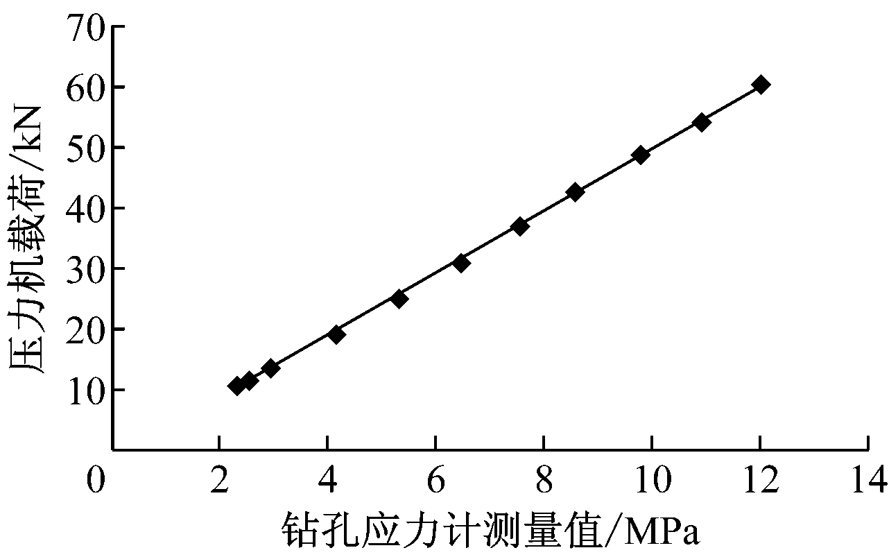 钻孔应力计监测结果如图7所示。利用最小二乘法对加载压力y和钻孔应力计测量压力x进行二次多项式回归,得出拟合方程y=5.090 6x-1.454 6,判定系数R2=0.999 6。可以看出,钻孔应力计测量值和压力机加载压力值具有良好的线性关系,说明钻孔应力计的测量值可以反映煤岩体的真实应力。