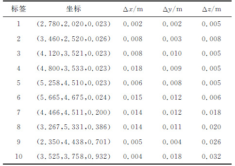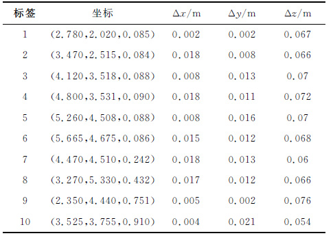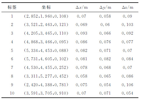 在所处环境中设置一定干扰和遮蔽以模拟井下环境,在未经算法处理时,定位系统测定结果及三维定位精度见表2,测定结果三维空间位置如图3所示。