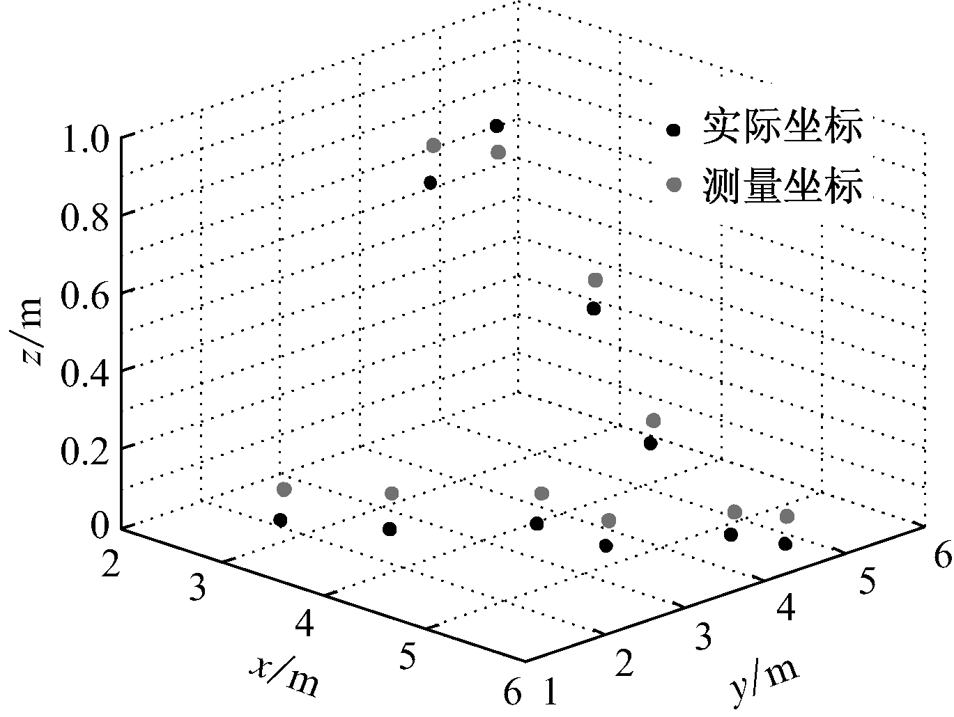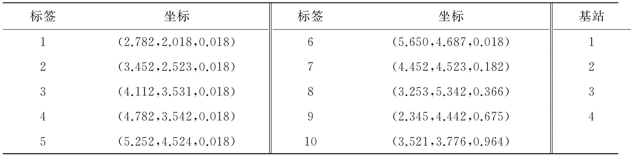 为验证信息过滤算法、神经网络算法对UWB定位精度的提升效果,采用基于UWB技术的Ubisense定位系统平台进行实验。在空间区域内布置4个UWB基站,为了测试到所有状态下的定位精度,随机布置10个定位标签,采用AOA信息结果作为状态方程结果模拟理论值。UWB基站布置如图2所示,根据实际环境建立局部坐标系,同时定义x,y,z轴方向。测定4个UWB基站的实际坐标及10个UWB定位标签的实际坐标,具体坐标值见表1。定位精度可由三维定位精度σP进行评价。
