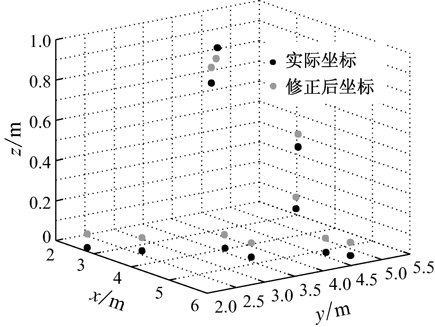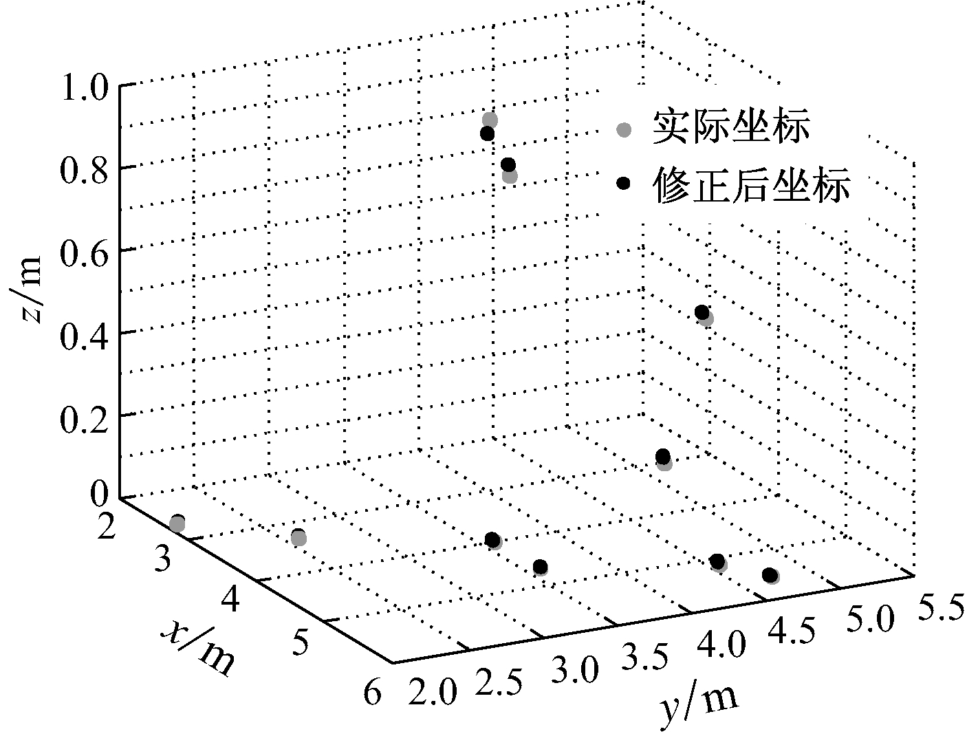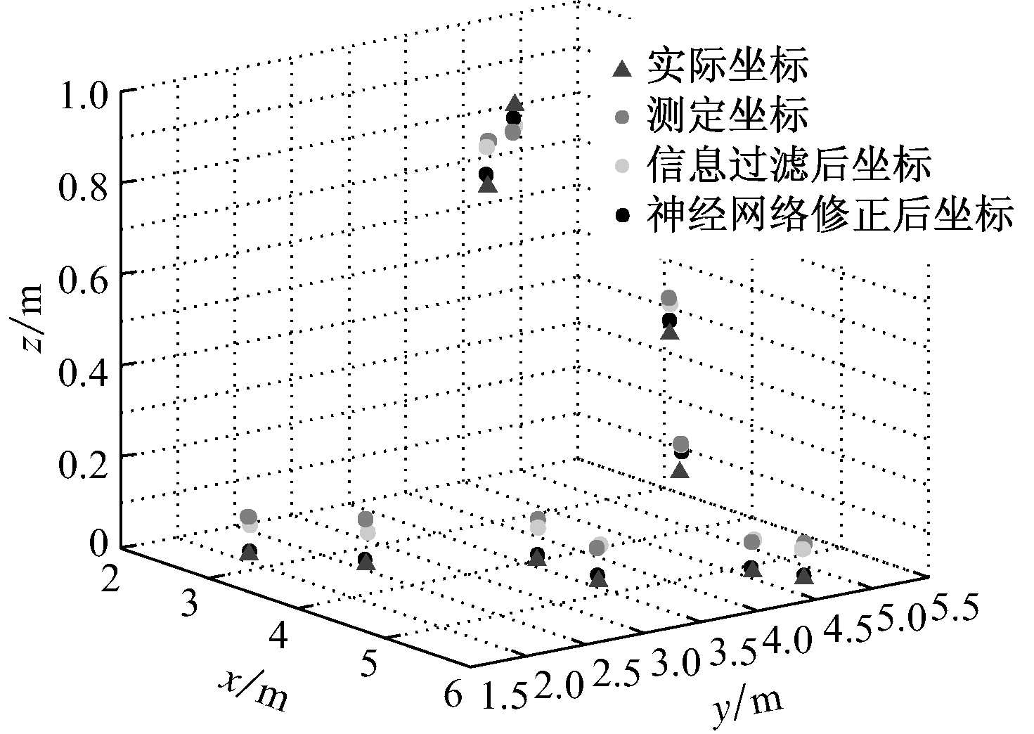 此时,σP=2.3,表明三维定位精度为2~3 cm。从图5可以清晰看出,实际坐标和经过2种算法修正后的坐标基本重合,神经网络对z轴上的精度有明显的提升。