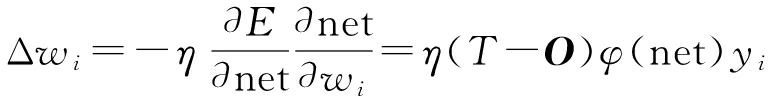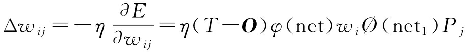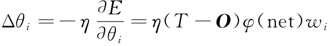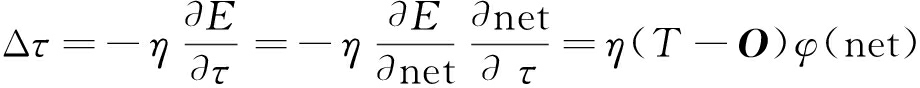 假设Pj表示输入层第j个节点的输入,j=1,2,…,N;wij表示隐含层第i个节点到输入层第j个节点之间的权值;θi表示隐含层第i个节点的阈值;Ø(x)表示隐含层的激励函数;wi表示输出层到隐含层第i个节点之间的权值,i=1,2,…,S;τ表示输出层的阈值;φ(x)表示输出层的激励函数,则信号的前向传播过程如下: