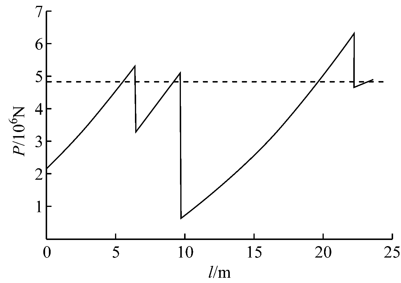 则式(16)中l的取值范围为(0,l21-x1),老顶破断后,支架受力发生改变。如图6所示,单个周期内老顶初次破断后到支架推过破断处期间,支架的工作阻力为