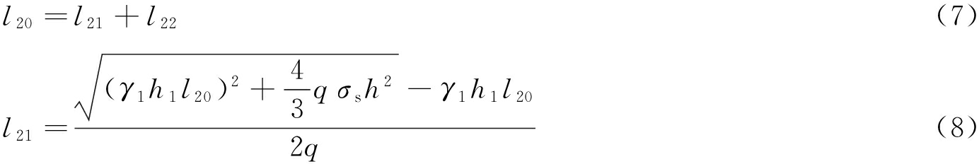 设上位岩层容重为γ1,层厚为h1,老顶上位岩层的破断距为l20,则F=γ1h1l20/2。若老顶第1次破断的破断距为l21,第2次破断的破断距为l22,则根据图4和图5可建立方程组: