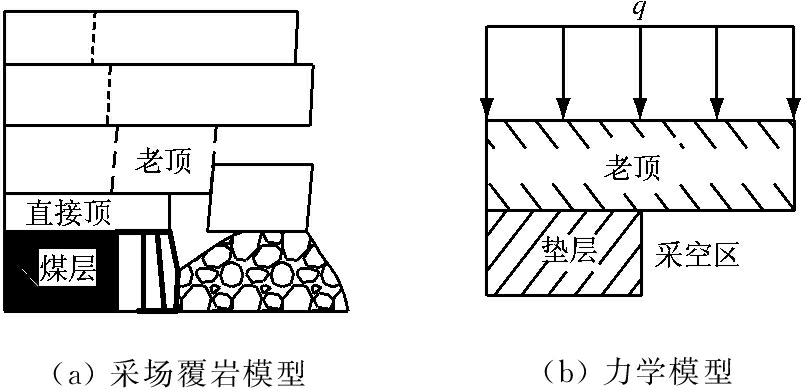 采场覆岩由多层岩石组成,每一层同时受上覆岩层和下部岩层的作用,上覆岩层的作用简化为载荷,下部岩层的支撑作用等效为弹性地基。建立如图2所示的采场覆岩破断模型,直接顶随采随冒,老顶的悬露长度不断连续变长,在老顶破断之前,对上部岩层始终起支撑作用。当老顶悬露长度达到其极限跨距时,老顶首次破断,支架工作阻力增大.但单层岩层破断带来的压力不一定能达到来压的程度,因此定义除老顶外多层顶板破断时工作面才会来压。