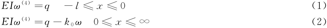 采煤工作面沿开切眼向前推进,顶板悬露在采空区,当悬露长度达到其极限跨距时,老顶发生破断。老顶初次破断前,形成两端固支、两侧半无限长的弹性基础梁结构,如图1(a)所示,其中F为固支端反力,M为固支端弯矩,q为载荷。两端的支座为破碎垮落的直接顶,视为垫层。设垫层系数(使地基产生单位沉陷所需的压强)为k0,沉陷量为ω,则单位面积的垫层对顶板的支撑力为k0ω[10]。