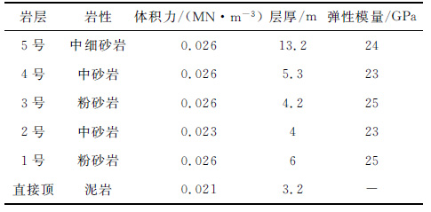 以某煤矿15201综采工作面为工程背景,研究采场顶板的破断形式和工作面来压情况。15201综采工作面煤层厚度为2.37~2.76 m,平均厚度为2.53 m,煤层倾角平均为6°;采用倾斜长壁一次采全高采煤方法,工作面长度为200 m。其采场顶板物理和力学性质见表1。直接顶为泥岩,随采随落,起支撑顶板作用。参照文献[13],设置垫层系数k0=0.3 GN/m3。支架中心距a=1.5 m,控顶距c=6 m。