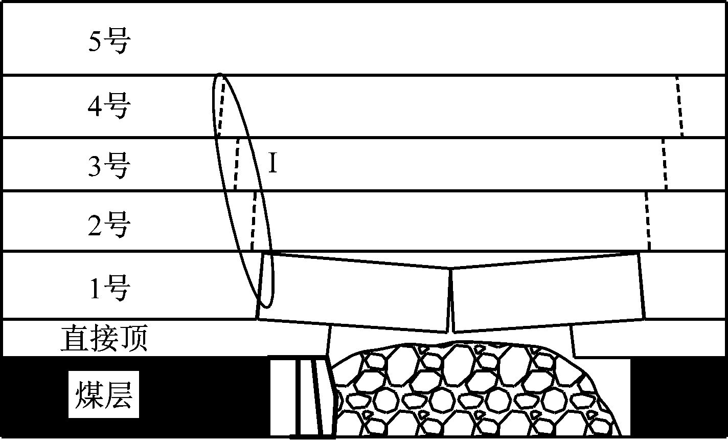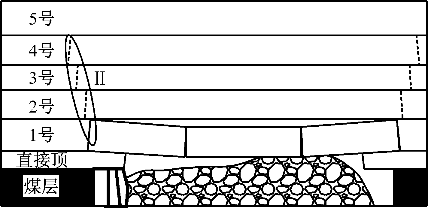 如图2所示,若老顶上部岩层的极限跨距小于老顶的极限跨距,当老顶发生破断时,上部岩层失去老顶的支撑作用,其悬露长度大于极限跨距,必然导致上部岩层和老顶一起破断,同时发生破断的顶板层数与极限跨距小于其下位岩层极限跨距的顶板层数相等。因此,当老顶发生破断时,发生工作面初次来压,来压步距即老顶极限跨距,为