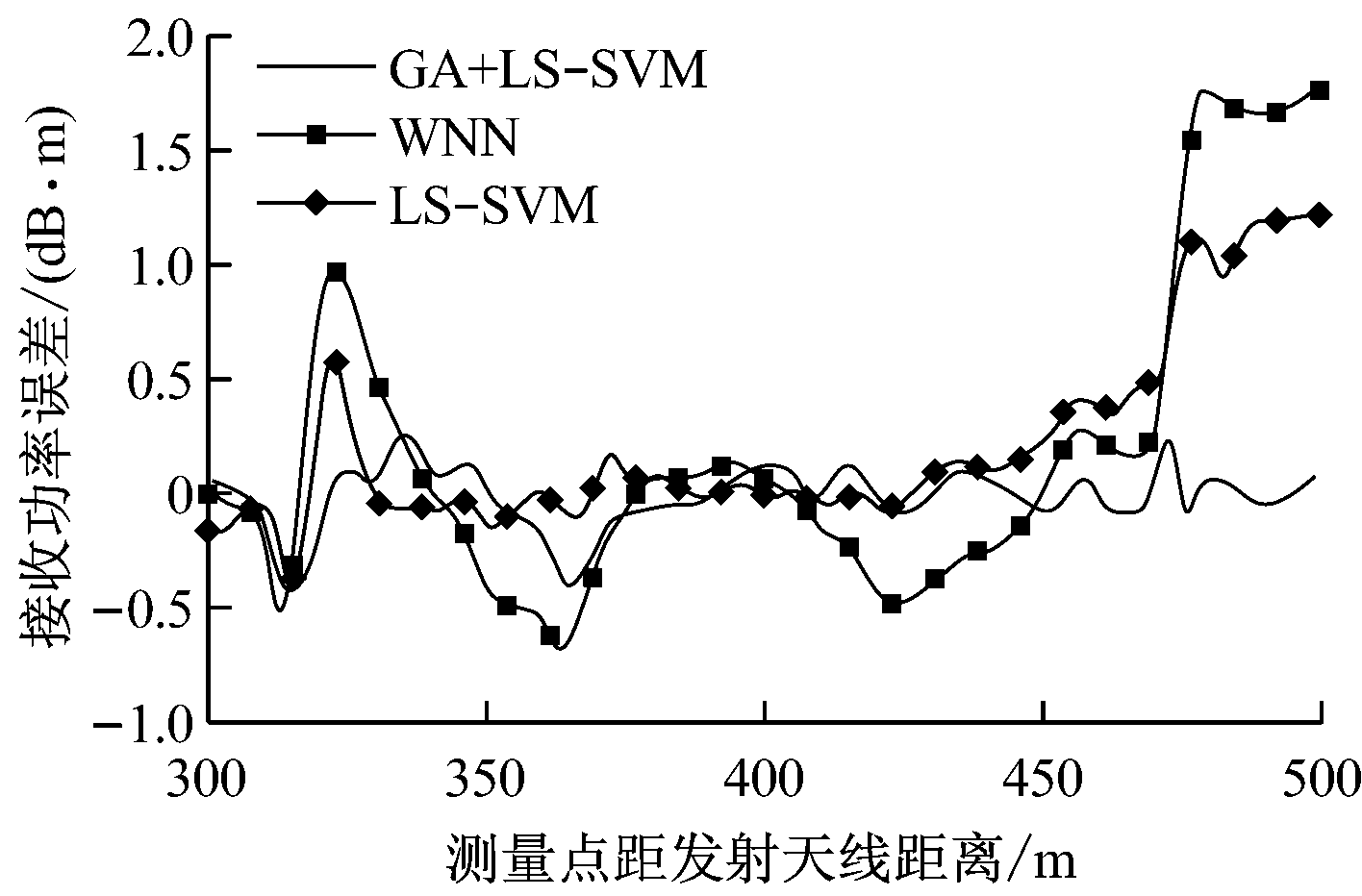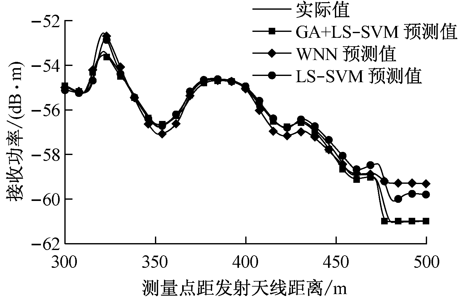 由图5和图6可以看出,经GA优化的LS-SVM方法能够更精确地对井下巷道场强进行预测,预测值更加接近实测值,预测误差也明显小于其他2种方法。而且从表2可以看出,经GA优化的LS-SVM建立的回归预测模型的平均绝对误差相对其他2种方法小了一个数量级,相关系数也较高,说明经GA优化的LS-SVM预测方法能够有效地提高井下场强预测的精度,获得更好的预测效果。