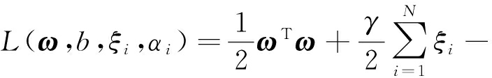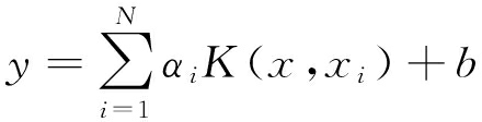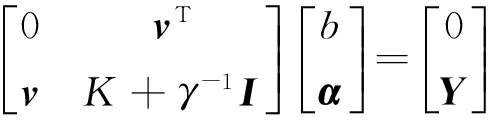 式中:v=[1 1 … 1]T;I为N阶单位矩阵;α=[α1α2…αN];Y=[y1y2…yN]T;K为N阶方阵,其第i行第j列的元素Kij=φ(xi)T×φ(xj)=K(xi,xj)。