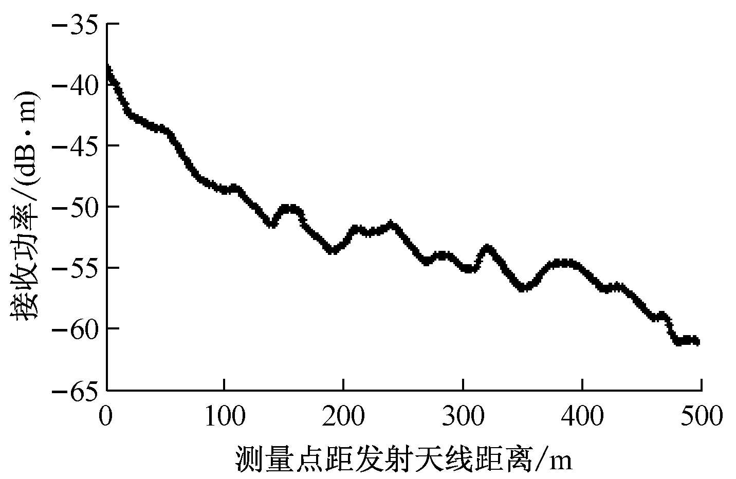 假设巷道长为500 m,每隔2 m设置一个测量点,共251个测量点,每个点记录20次测量数据。为了保证数据的有效性,有必要对数据进行预处理,滤除快衰落的影响,对每个测量点的数据进行算术平均,最后得到251个测量点的平均接收功率,如图3所示。在仿真中使用前150个数据作为训练集,后101个数据作为测试集。