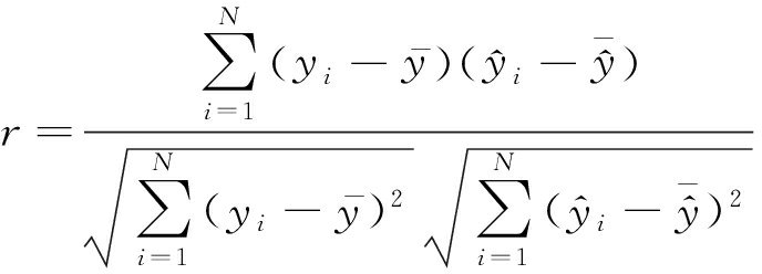 使用预测值和实测值之间的平均绝对误差(MAE)、均方根误差(RMSE)和相关系数r作为模型预测性能的评价指标,3个指标的定义分别如式(7)—式(9)所示。